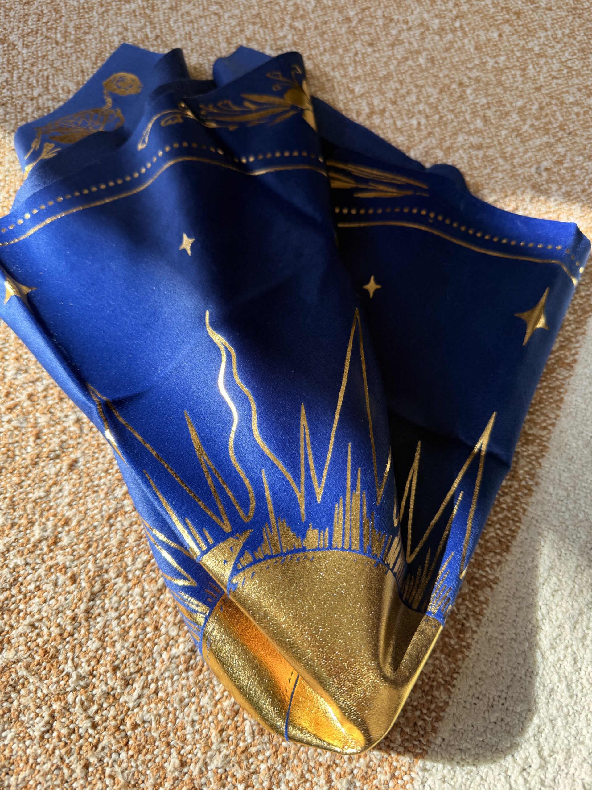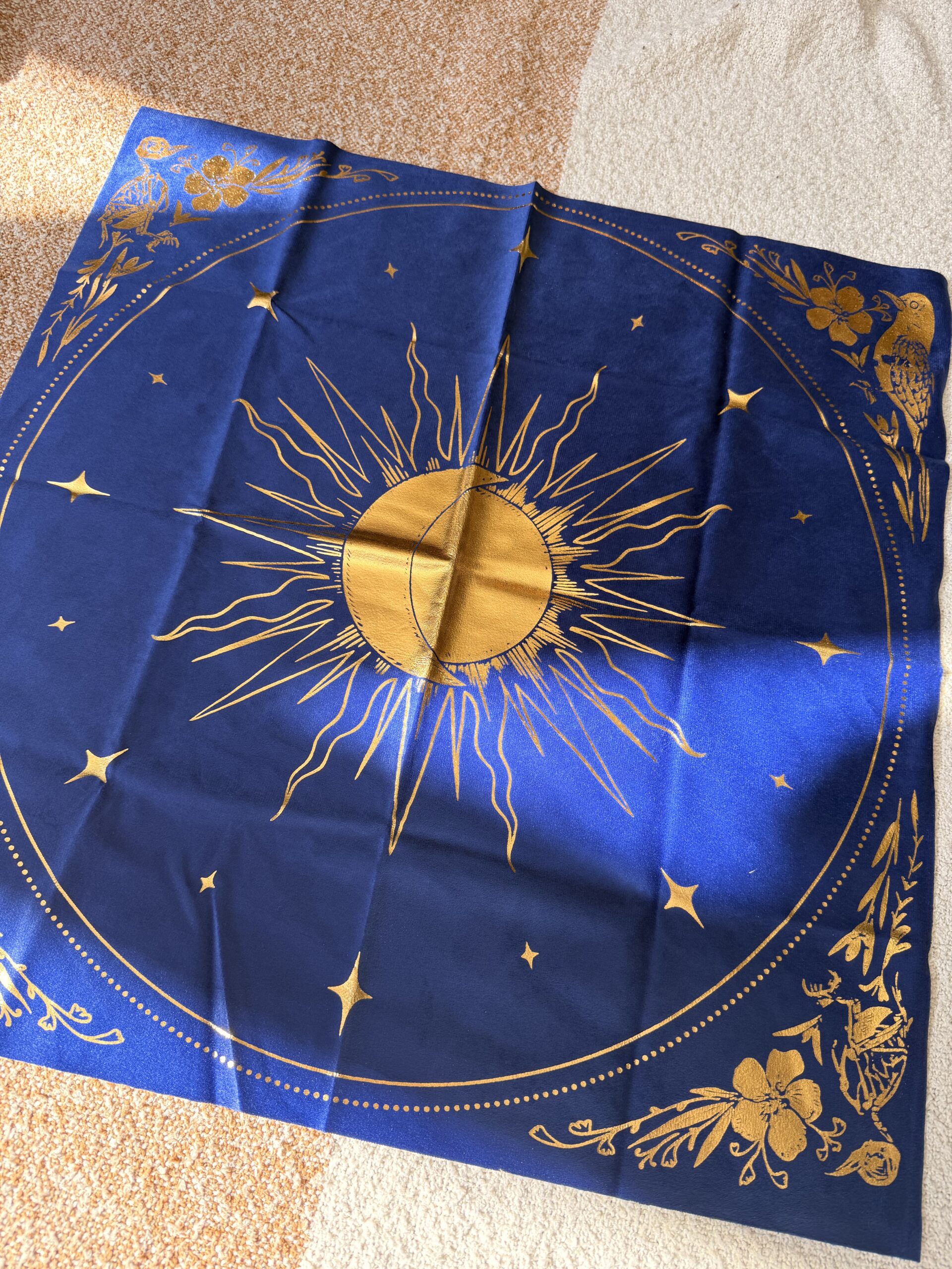 La nappe d’autel céleste présente une composition enchanteresse du soleil, de la lune, des colombes des rochers et de leurs formes squelettiques, entrelacés avec des fleurs délicates pour créer une toile de fond rituelle saisissante. Mesurant environ 22 × 22 pouces, chaque nappe de velours est ornée d’un cachet métallique. Chaque pièce étant estampillée à la main, de légères variations de couleur ou d’impression sont possibles. Pour préserver sa beauté, nettoyez-la délicatement à l’eau froide et suspendez-la pour la faire sécher – évitez de la laver en machine.