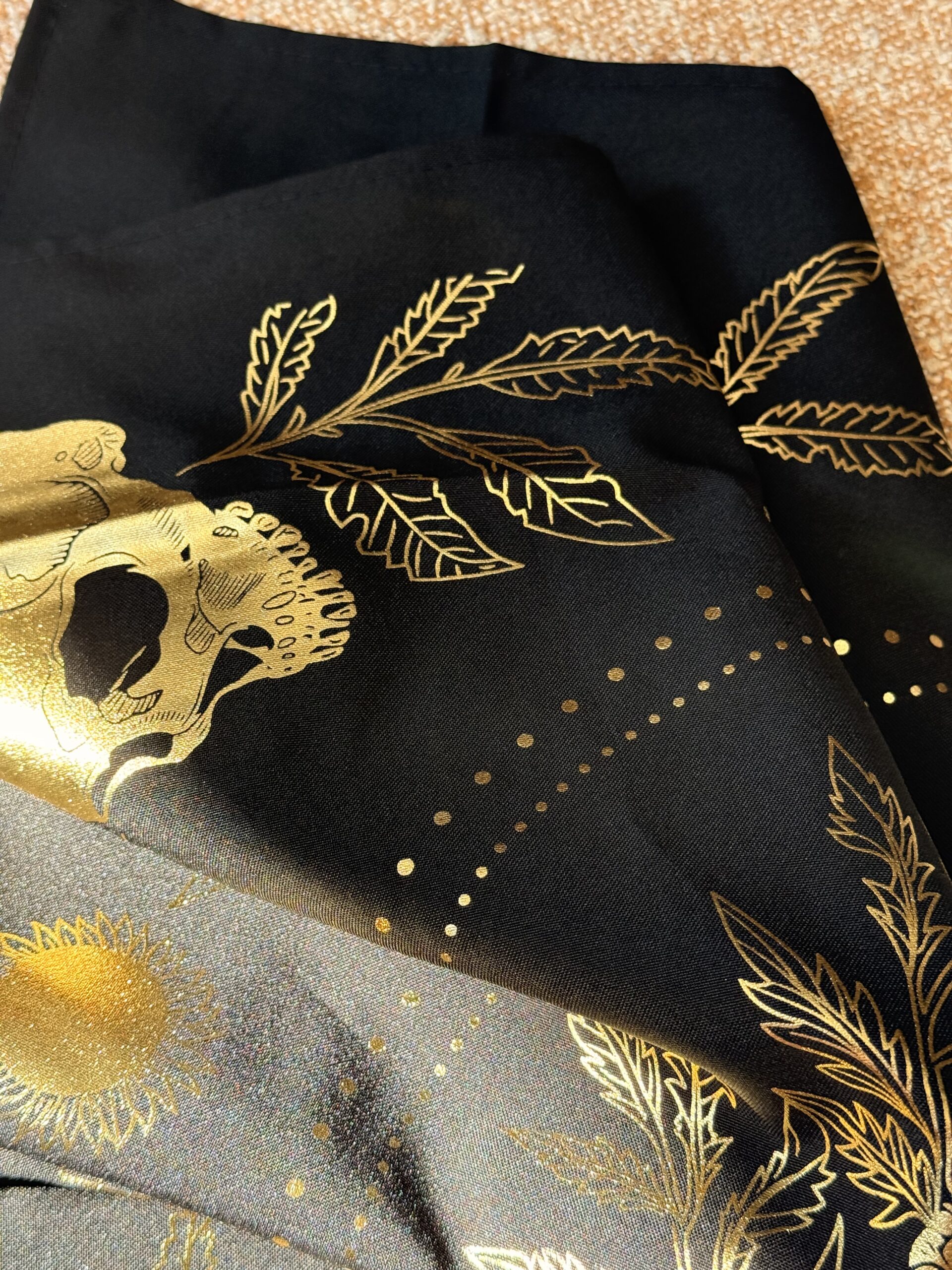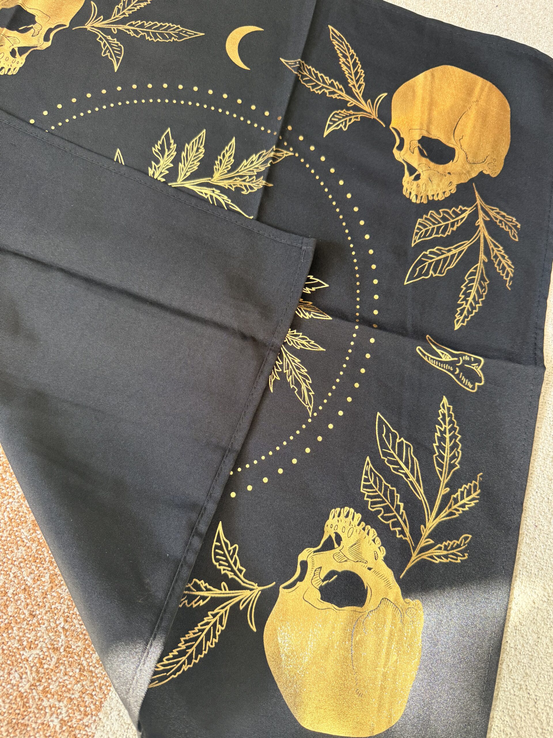Conçue pour accompagner le jeu de tarot Marigold, la nappe de tarot « Teeth and Bone » rassemble l’imagerie symbolique du soleil, de la lune, des crânes, des dents et de la signature marigold pour créer une surface frappante pour vos lectures. Mesurant approximativement 22 × 22 pouces, chaque tissu en coton est estampillé à la main en or métallique, ce qui rend chaque pièce légèrement unique en termes de tonalité et d’impression. En raison de sa nature artisanale, des variations mineures peuvent survenir. Pour préserver la finition, nettoyez délicatement à l’eau froide et suspendez pour sécher. Ne pas laver en machine.