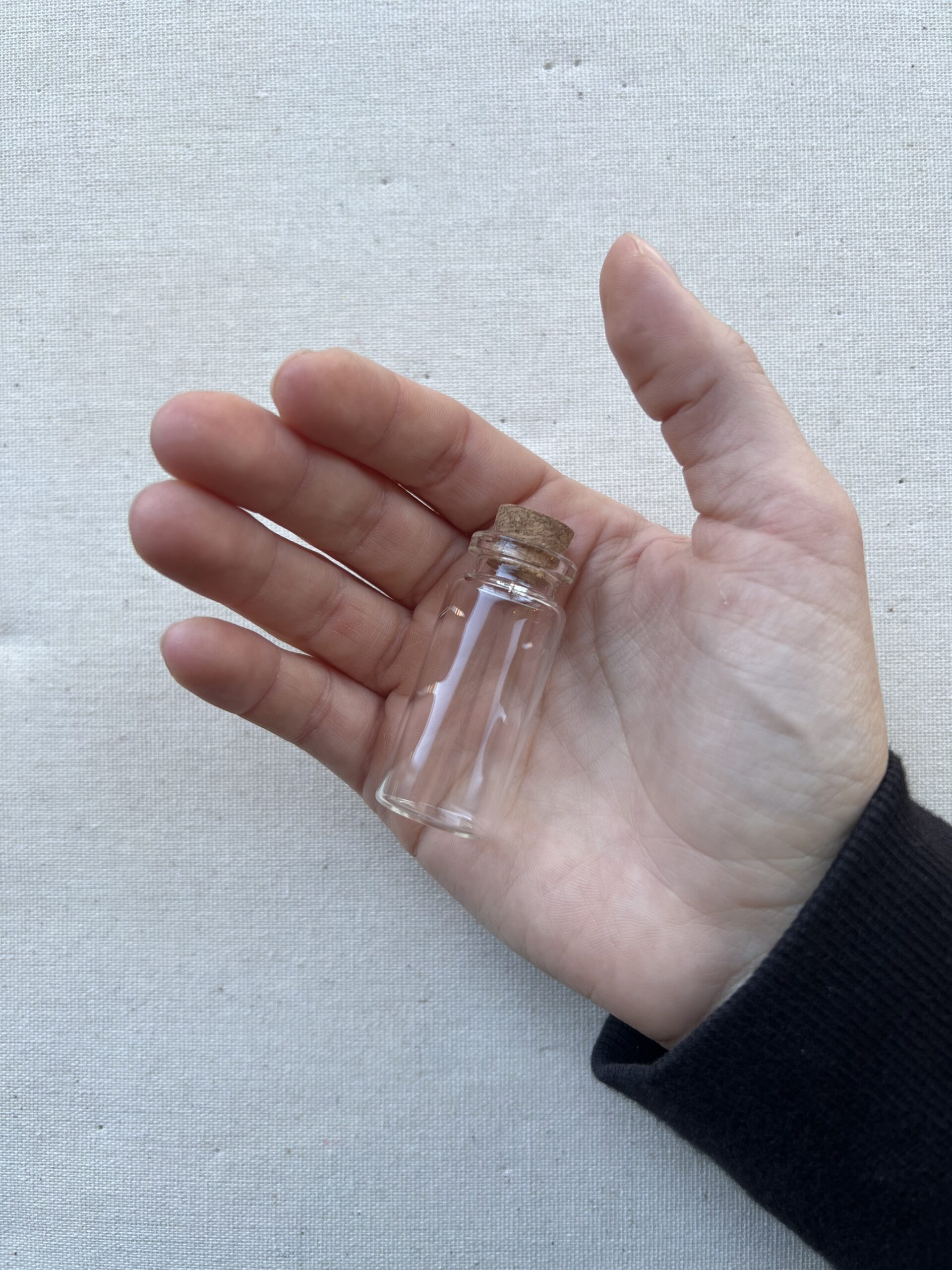 A small glass jar with a natural cork closure, perfect for holding written intentions, oils, or small symbolic elements. Suitable for spell work, rituals, or decorative altar use.