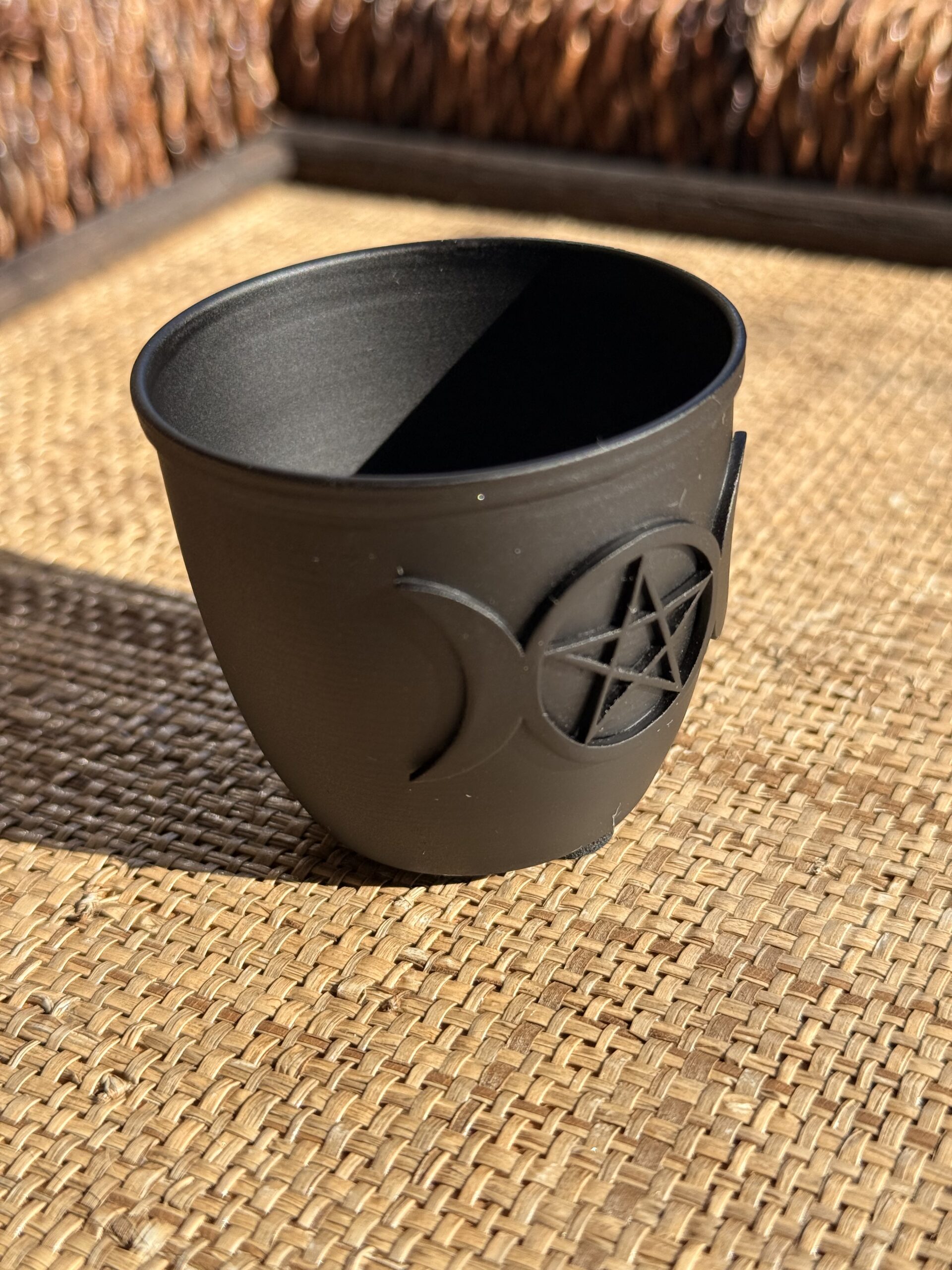 This compact 2.5-inch iron pot candle holder features a triple moon pentacle design, symbolizing the phases of the moon and the unity of mind, body, and spirit. Crafted from durable cast iron, it is ideal for holding tealights or small ritual candles. Its versatile design makes it suitable for altar use, meditation spaces, or as a decorative piece. The smooth, sturdy construction ensures long-lasting functionality and ease of use.