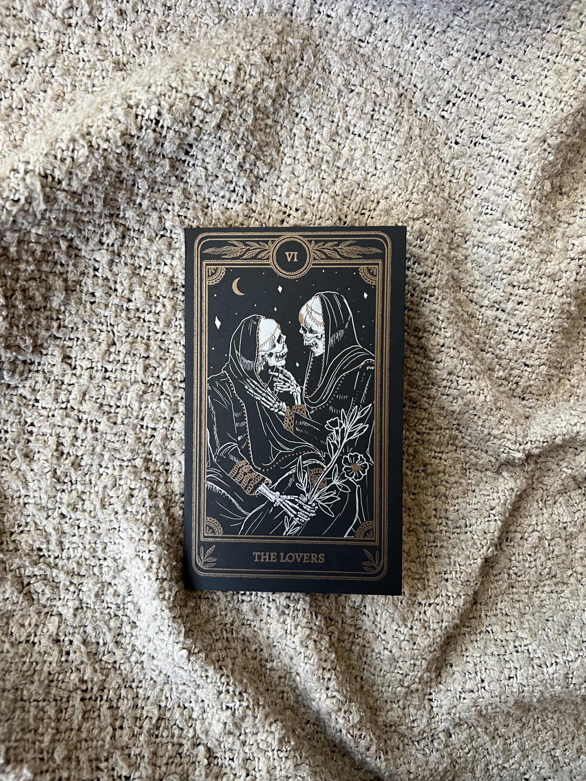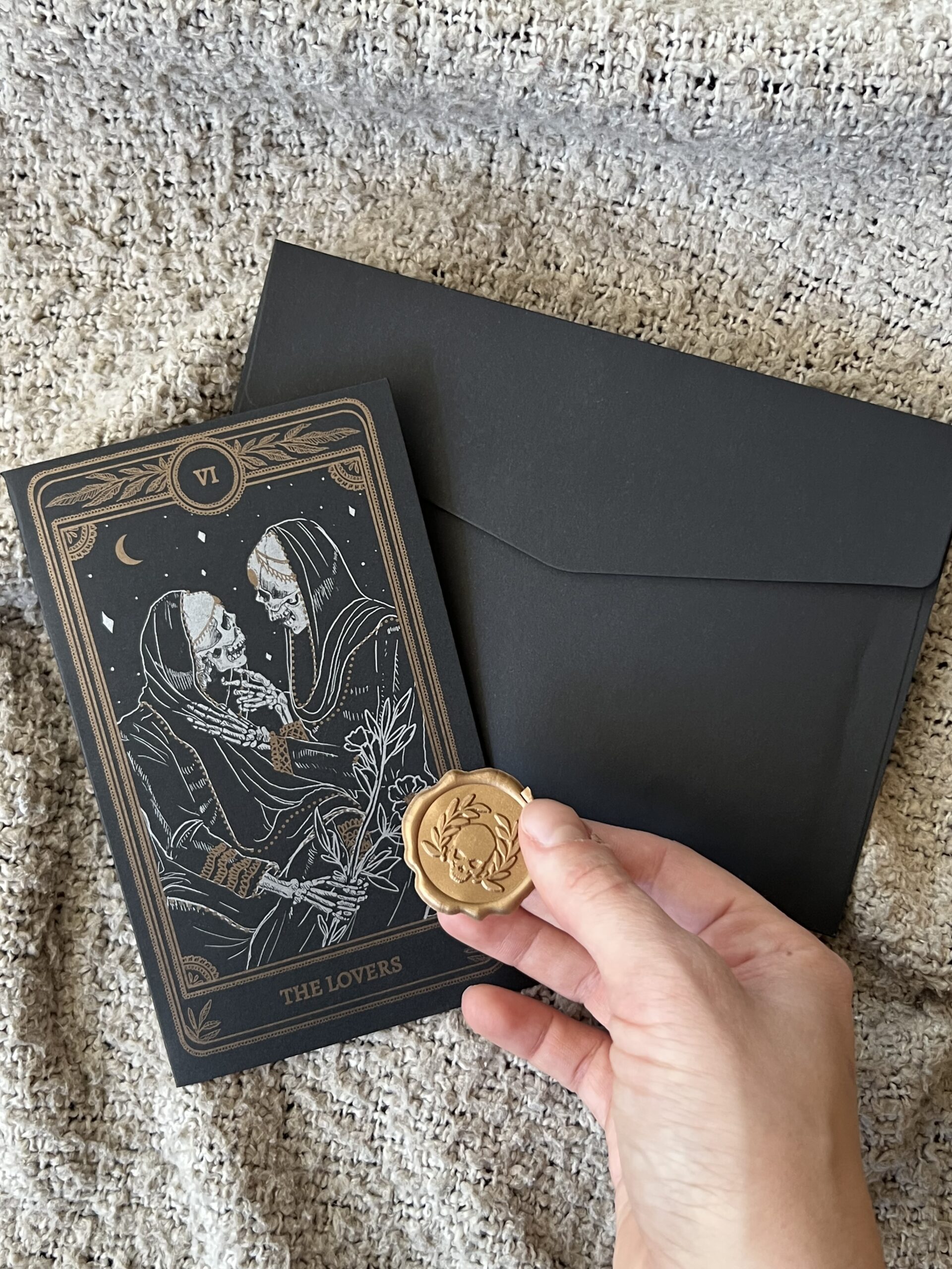 This greeting card showcases the mystical “Lovers” tarot card design from the Marigold Tarot deck, printed with a beautiful metallic finish for a subtle shine. Measuring 6 x 3.75 inches, it’s crafted on sturdy 250 gsm paper with a blank white interior, perfect for your personal message. Each card comes with a 100 gsm black envelope and is sealed with a gold logo wax seal for an elegant, magical touch.