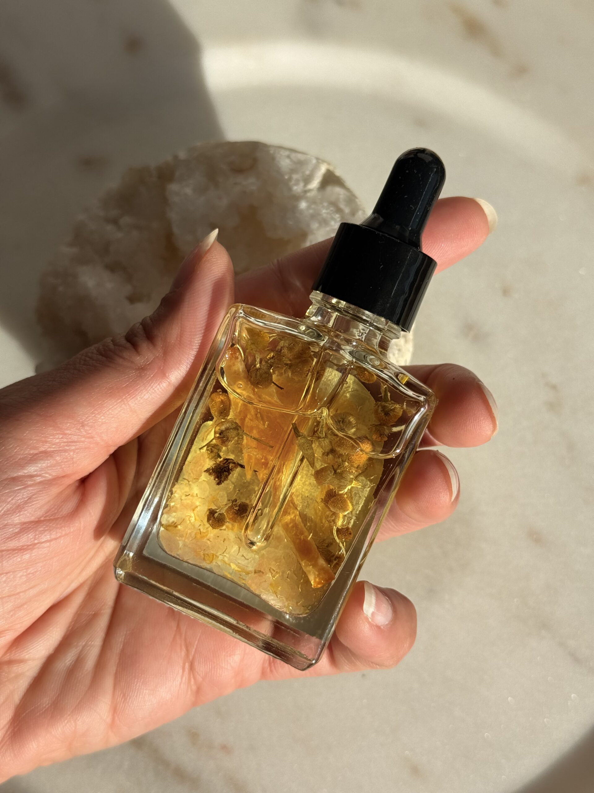 Handmade in Canada with jojoba oil, natural herbs and essential oils. Our oils are packaged in a 1oz/30mL flacon with dropper for easy use.